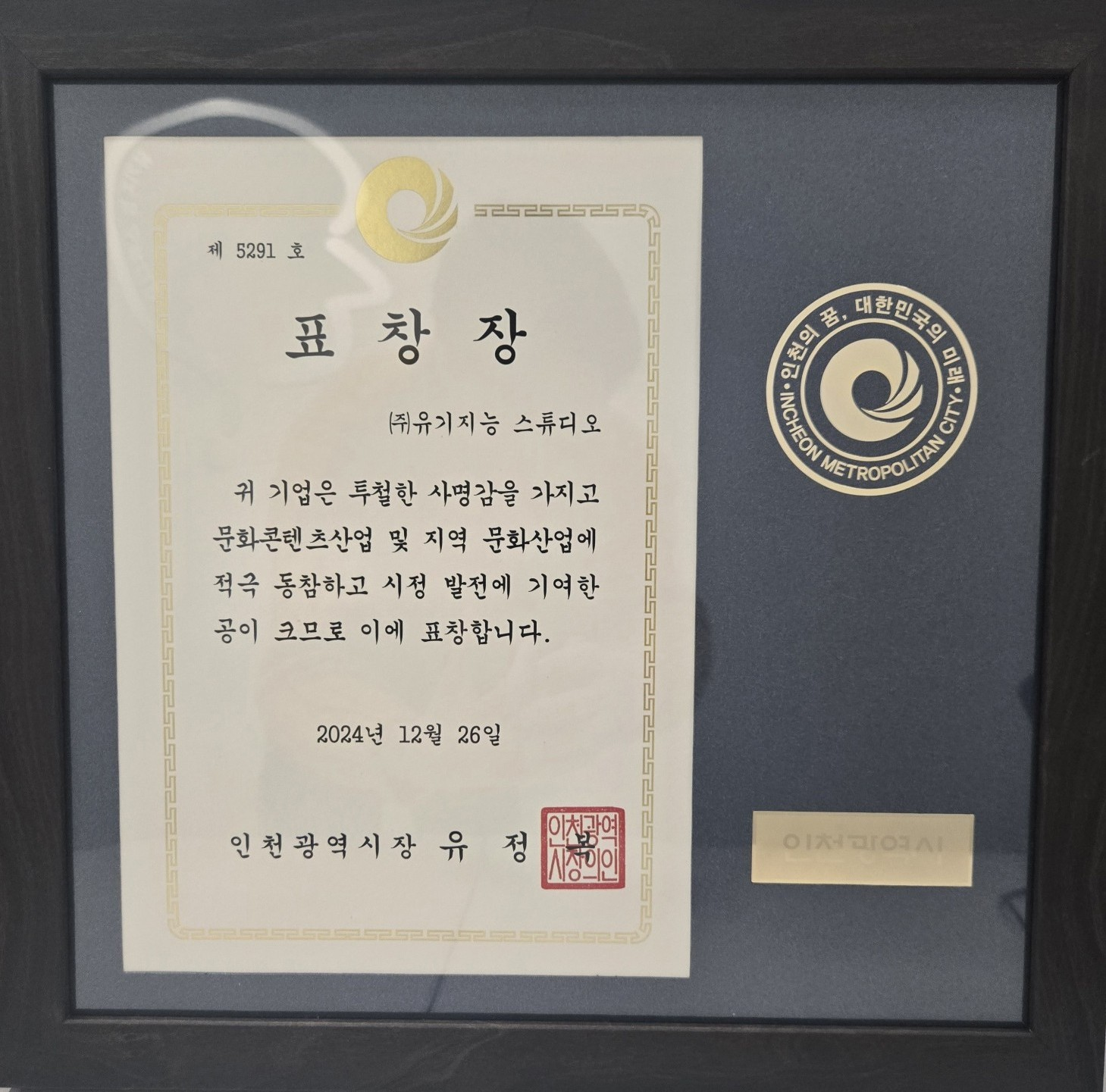 We are pleased to announce that we have been selected as a contributing company to the cultural content industry in Incheon for 2024, and we have been awarded a Certificate of Commendation by the Mayor of Incheon.